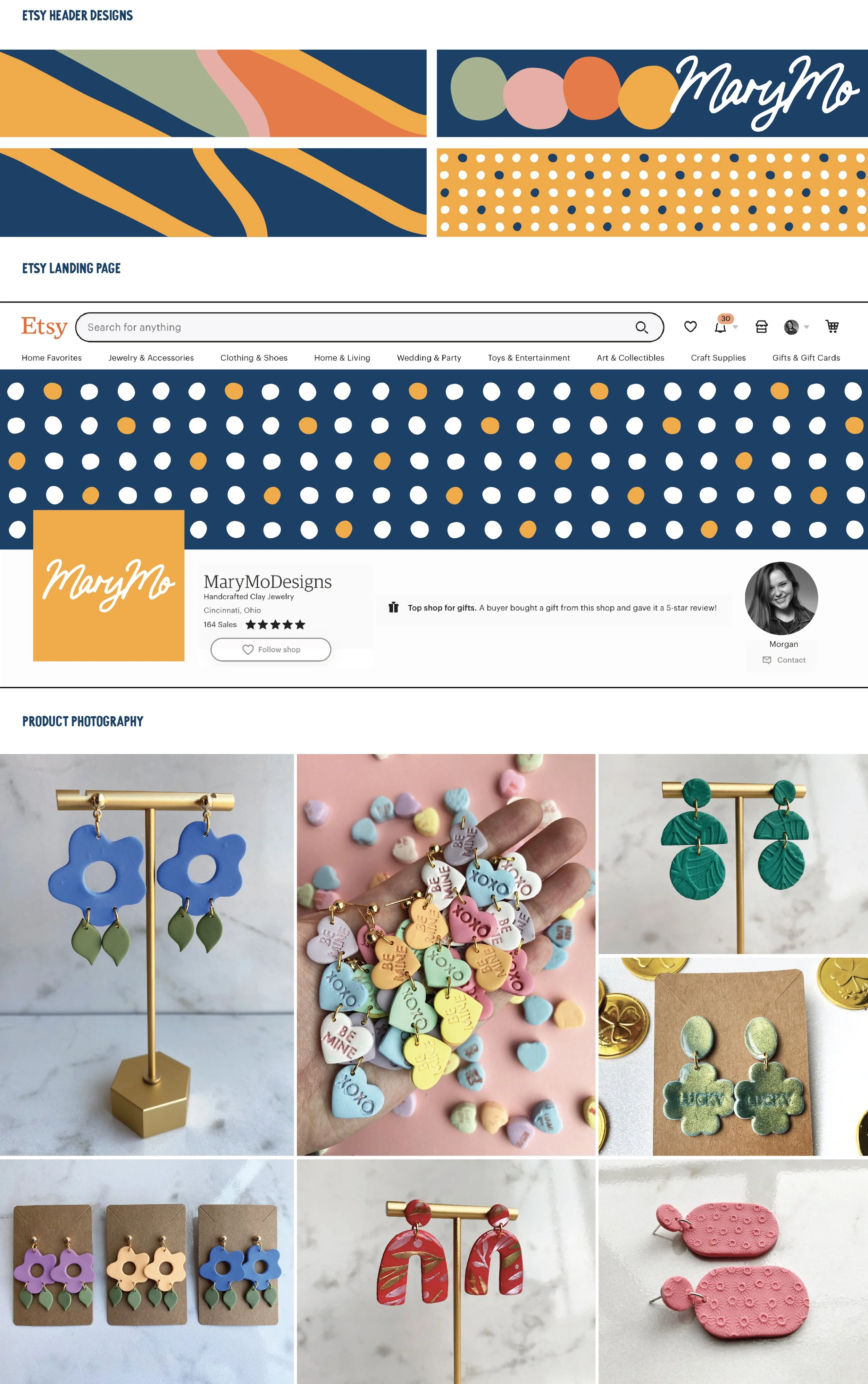 Logo and branding designed for my Etsy business, MaryMo. For this brand I created header designs, business cards, and completed all of the product photography. MaryMo was primarily created to sell polymer clay jewelry under the name MaryMo ClayCo but has been rebranded to embody more of the work that I create along with jewelry design. Link to view Etsy Shop